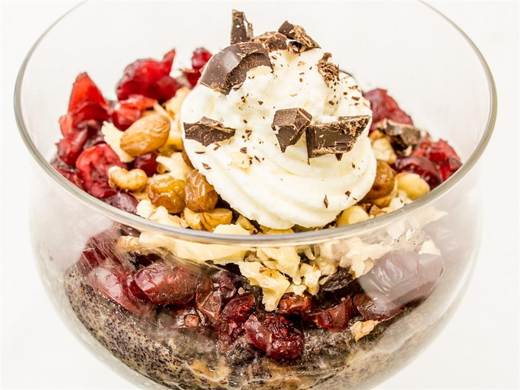 Białka ubić na sztywno, dodać cukier, wiórki kokosowe ciągle mieszając. Formować małe placki na formie wyłożonej papierem, piec w piekarniku na 180oC. Ananas, kiwi, banan, pokroić w paski, rodzynki sparzyć wodą i namoczyć spirytusem. Migdały sparzyć obrać ze skórki i pokroić w paseczki. Masło zmiksować lub utrzeć na masę, ubić jajka z cukrem. Ubite jajka wlać powoli do masła, cały czas mieszając, dodać likier kokosowy.