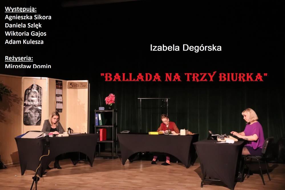 „Ballada na trzy biurka” to wspaniale napisana komedia, która nie tylko rozśmiesza, ale także zmusza widza do refleksji. Bohaterkami sztuki są trzy pracownice upadającego banku: kadrowa tuż przed emeryturą, księgowa nimfomanka po czterdziestce, oraz dwudziestoletnia maszynistka z aspiracjami zawodowymi. Z tego spotkania wyniknie wiele zabawnych sytuacji i niekontrolowanych rozmów, jakby z życia wziętych.