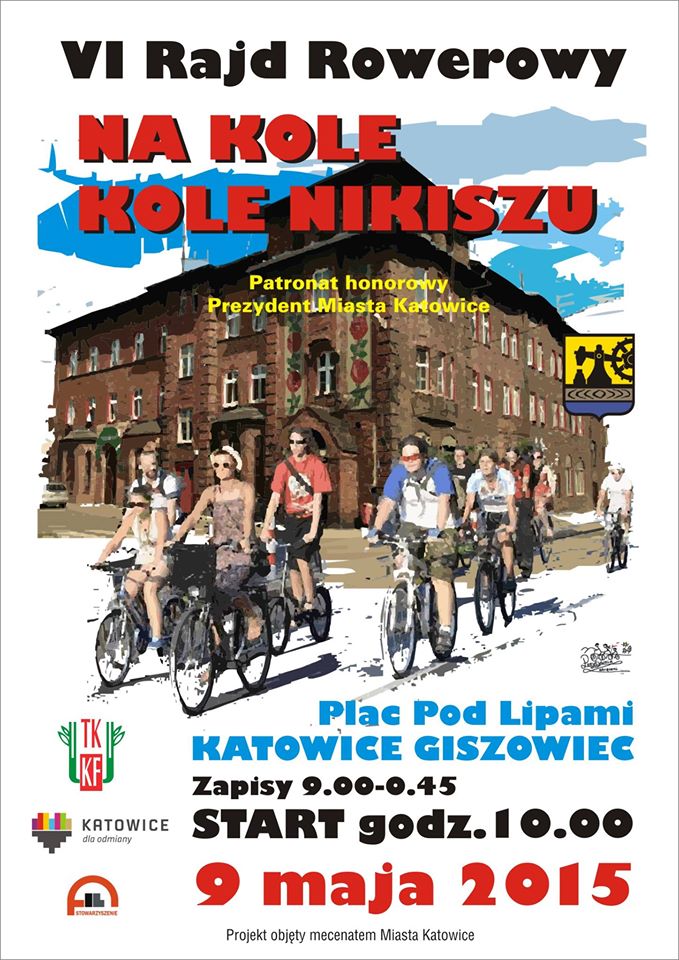 9 maja zapraszamy na VI Rajd Rowerowy NA KOLE KOLE NIKISZU. Rajd jest organizowany przez MTKKF i klub rowerowy Pozytywnie Zakręceni koło PTTK nr Katowice. Rozpoczęcie imprezy na Giszowcu w Parku Pod Lipami. Zapisy od godz. 9: 00 do 9:45. Start o godz. 10:00. Trasa biegnie przez Giszowiec do ośrodka Janina, następnie leśnym traktem do Doliny 3 Stawów, a dalej do fabryki porcelany na Bogucicach (punkt pośredni i niespodzianka). Z fabryki trasa prowadzi obok stawu Upadowa do Galerii Wilson (pieczątka) i dalej już ul. Szopienicką na metę zorganizowaną na terenie parafii św. Anny, gdzie na strudzonych rowerzystów czeka najlepszy na świecie żur z Nikiszu z najlepszym chlebem, bo także z Nikiszu... no i losowanie atrakcyjnych nagród. Liczba uczestników ograniczona - 250 osób.
