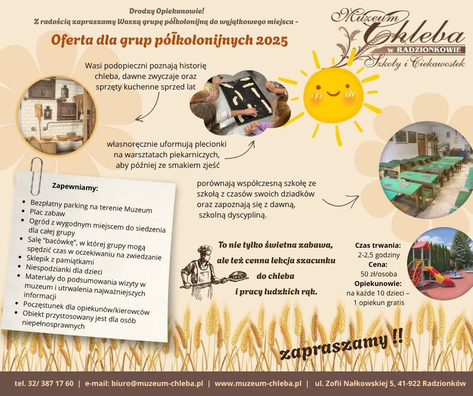 Zapraszamy grupy półkolonijne do Muzeum Chleba w Radzionkowie! W tym muzeum dzieci przeniosą się w świat dawnych tradycji, poznają historię chleba i spróbują swoich sił w formowaniu pieczywa! Rezerwacje pod nr tel. 32/ 387 17 60 lub email: biuro@muzeum-chleba.pl