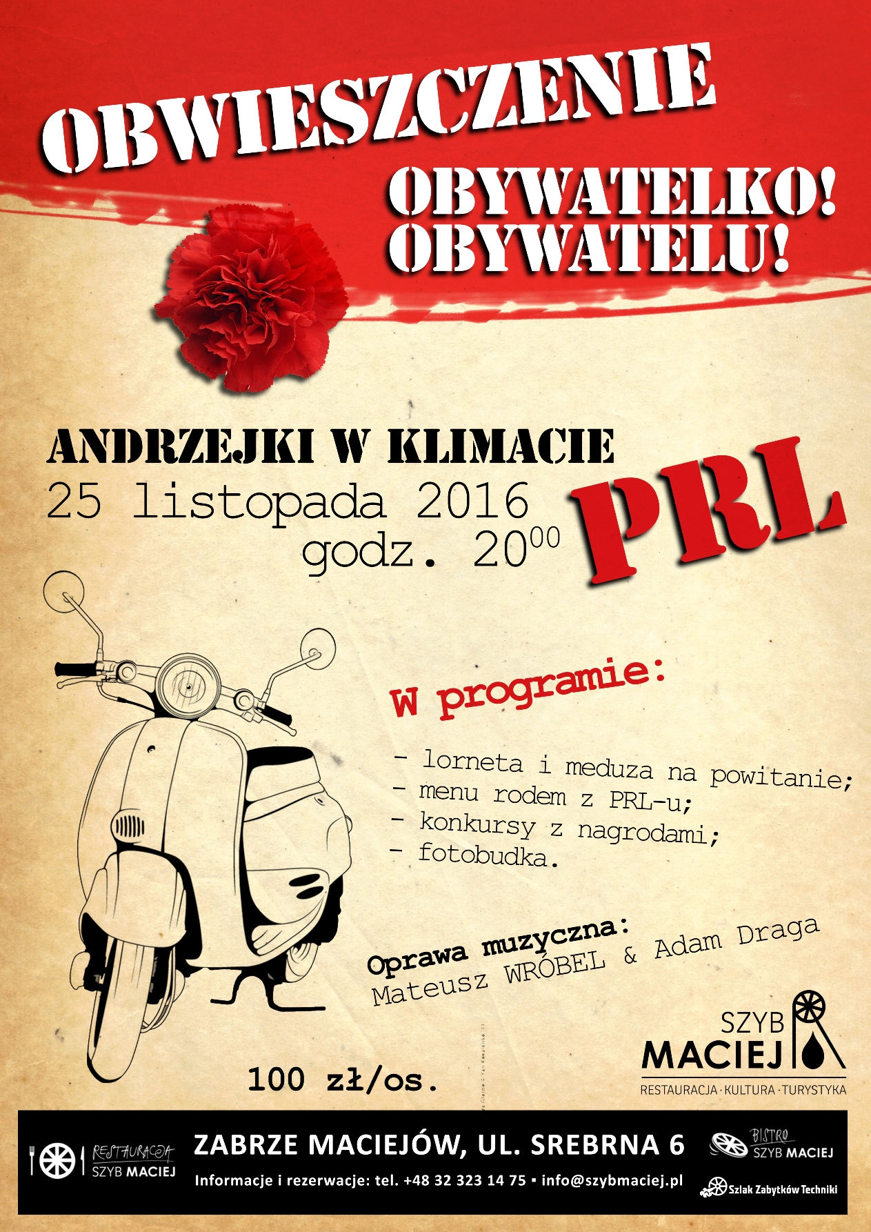 Kolejny zabrzański obiekt – Szyb Maciej - zaprasza na tradycyjną zabawę andrzejkową, tym razem w klimacie PRLu. Królować będzie „seta i galareta”, menu rodem z PRLu, a wyjątkowy duet muzyczny – Mateusz Wróbel i Adam Draga, premierowo zaserwują dawkę najlepszej muzyki z okresu PRL. W programie liczne atrakcje, m.in. fotobudka i konkursy z nagrodami.