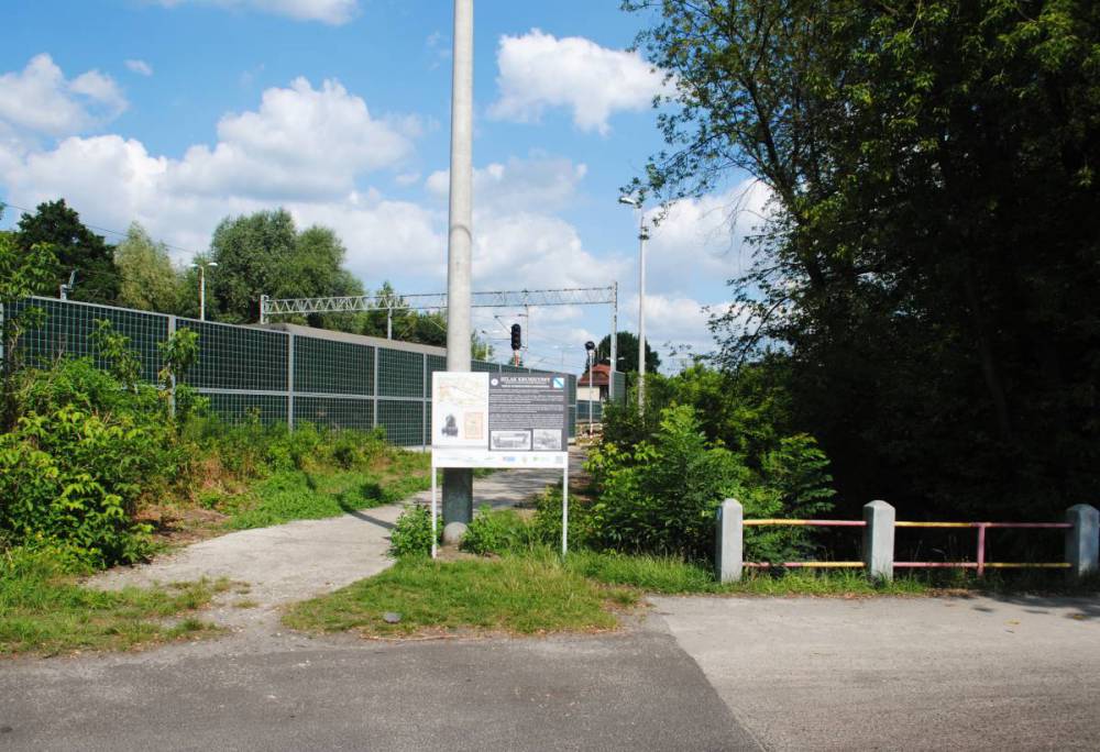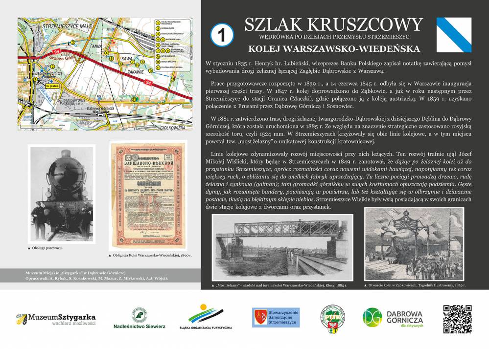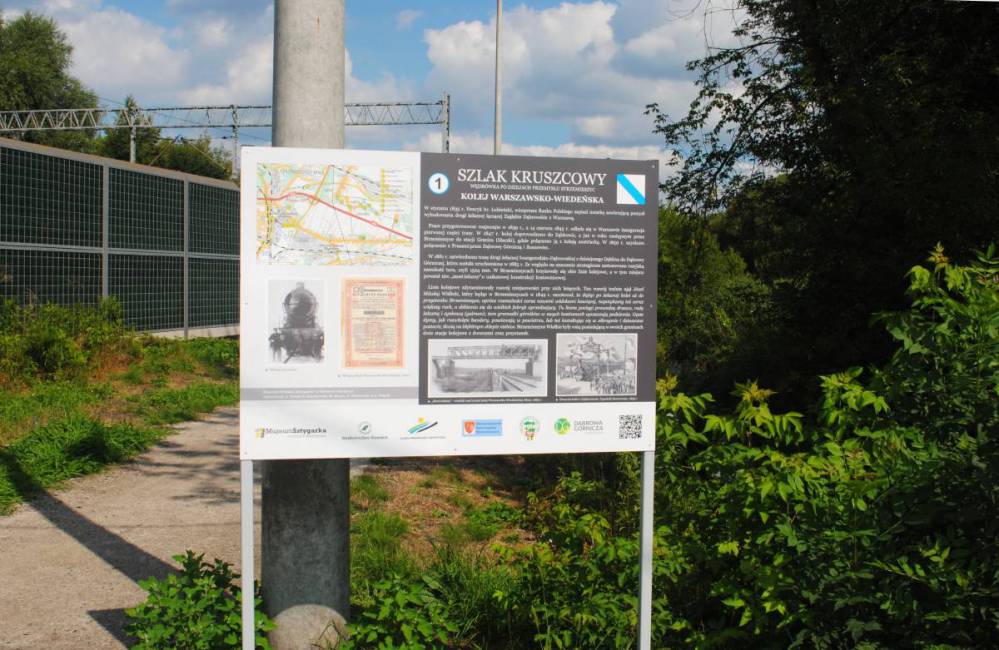 Kolej Żelazna Warszawsko-Wiedeńska (czyli Warszawsko-Wienskaja Żelaznaja Doroga) ruszyła na trasę w 1845 r. i stała się impulsem rozwoju tych miejscowości, przez które przeszła. Dość wspomnieć, że taki Kromołów, w którego cieniu rozwijała się wieś Zawiercie, po ominięciu go przez Kolej Warszawsko-Wiedeńską, stał się marginalną miejscowością (poźniej dzielnicą rzeczonego Zawiercia). Identyczna sytuacja miała miejsce w Myszkowie, Sosnowcu i miejcowościach, tworzących dzisiejszą Dąbrowę Górniczą. Szczegóły historii Kolei Warszawsko-Wiedeńskiej przybliża wspomniana tablica.