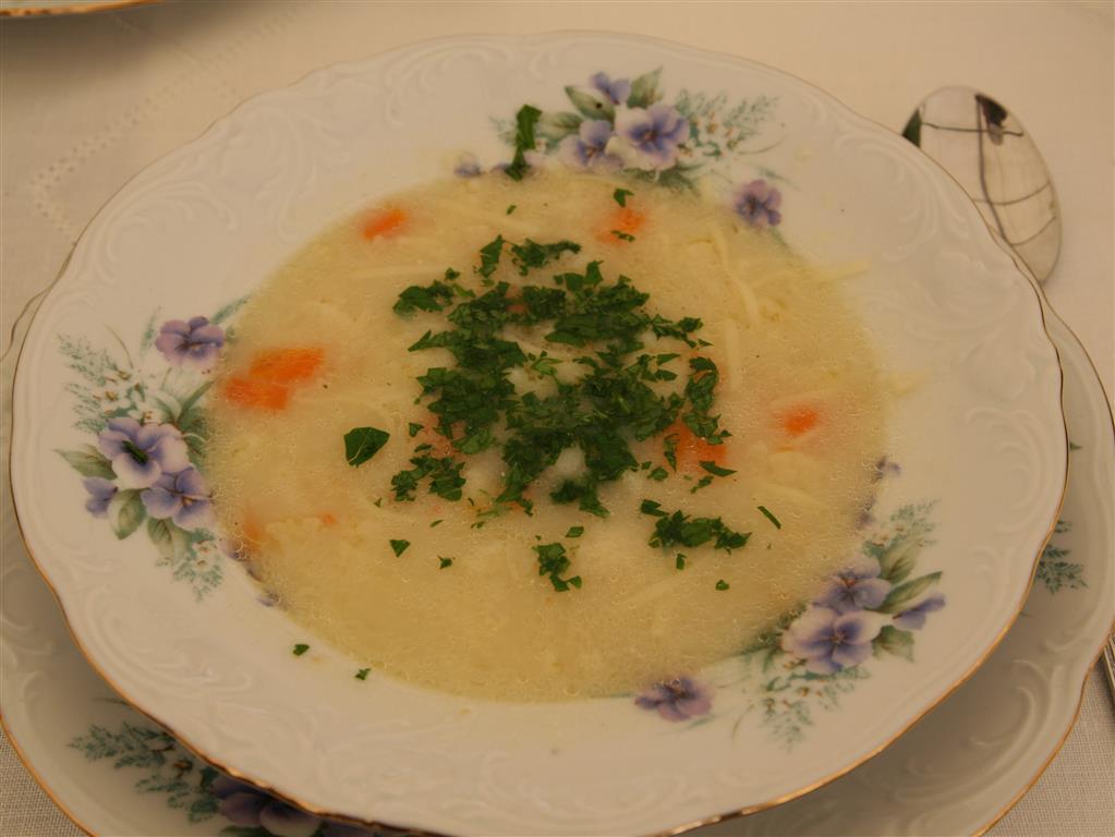 Warzywa obrać, opłukać. Kurę umyć. Podzielić na 4 kawałki. Do gotującej się wody dodać mięso i warzywa. Gotować na małym ogniu, bez przykrycia. Odcedzić, usunąć nadmiar tłuszczu. Przygotować kluski z grysiku – wymieszać dobrze, dodać trochę soli, lać na gotującą wodę, przelać zimną wodą, dodać do rosołu.