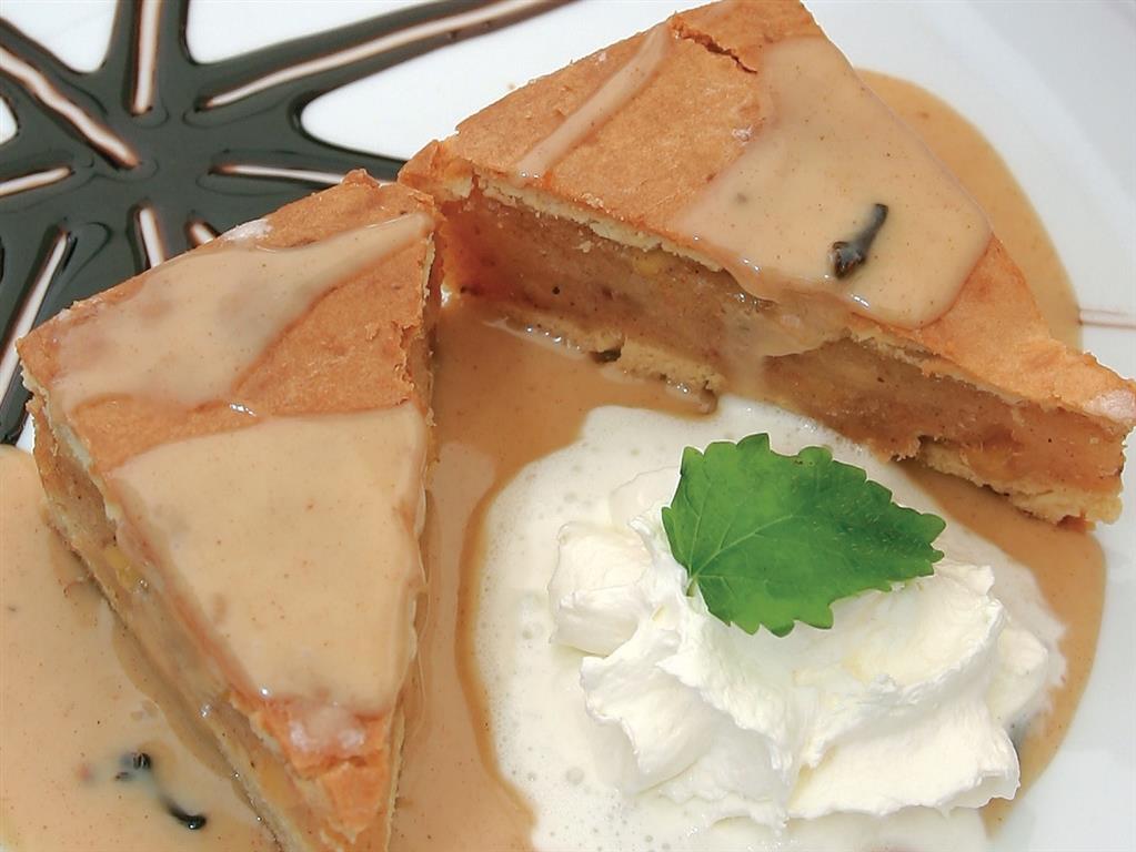 Z mąki, masła, jajek, proszku do pieczenia i cukru waniliowego zarabiamy ciasto, po czym schładzamy je ok. pół godziny w lodówce. Po schłodzeniu dzielimy je na dwie części, rozwałkowujemy i wykładamy na wysmarowaną i obsypaną bułką tartą formę. Nakładamy masę z prażonych jabłek i przykrywamy drugą partią rozwałkowanego ciasta. Pieczemy w temperaturze 180°C przez około 60 min. Sos sporządzamy, łącząc wszystkie składniki, a następnie redukując je na małym ogniu aż do zgęstnienia. Jabłecznik przed podaniem obsypujemy cukrem pudrem i polewamy sosem.