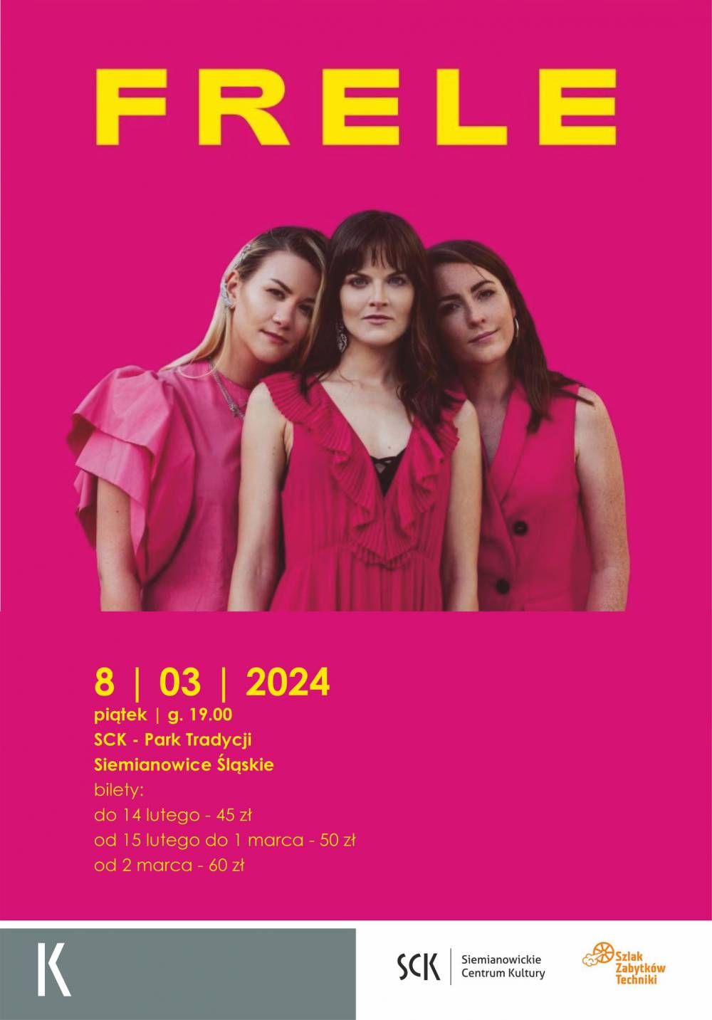 8 marca w piątek, o godz. 19.00 zapraszamy na koncert żeńskiego tria FRELE - w sam raz na Dzień Kobiet. Bilety do nabycia w kasach SCK oraz on-line.