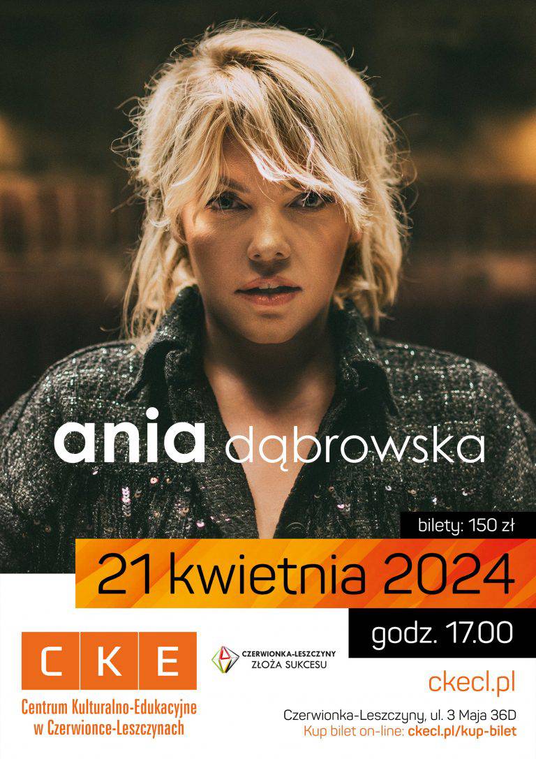 Zapraszamy do CKE w Czerwionce-Leszczynach 21 kwietnia 2024 na koncert Ani Dąbrowskiej. Koncerty Ani Dąbrowskiej nieustannie przyciągają rzeszę fanów, których liczba stale rośnie. Artystka zjednała sobie serca publiczności utworami, które mówią o sprawach dotyczących każdego takie jak między innymi zawody miłosne.
