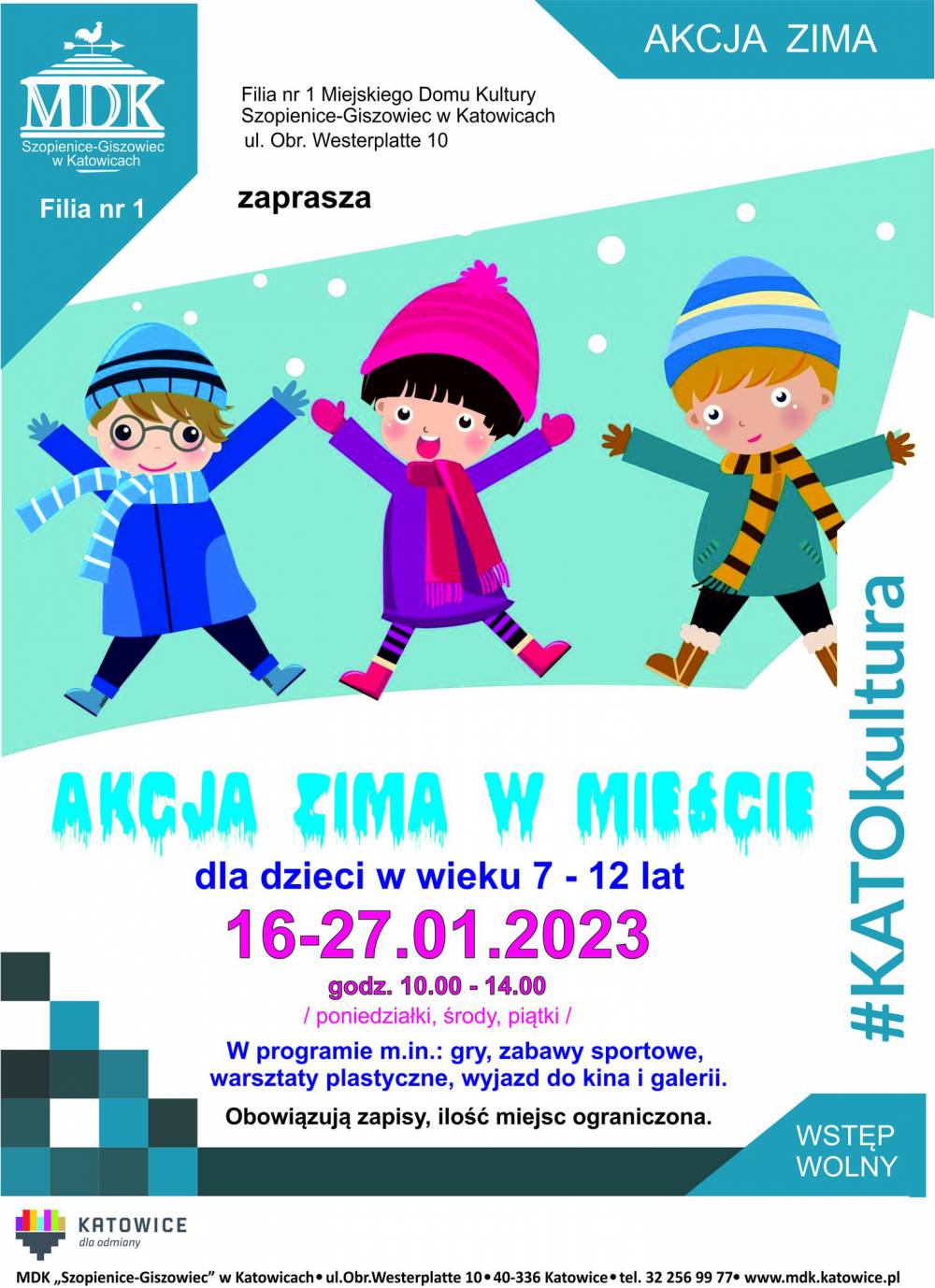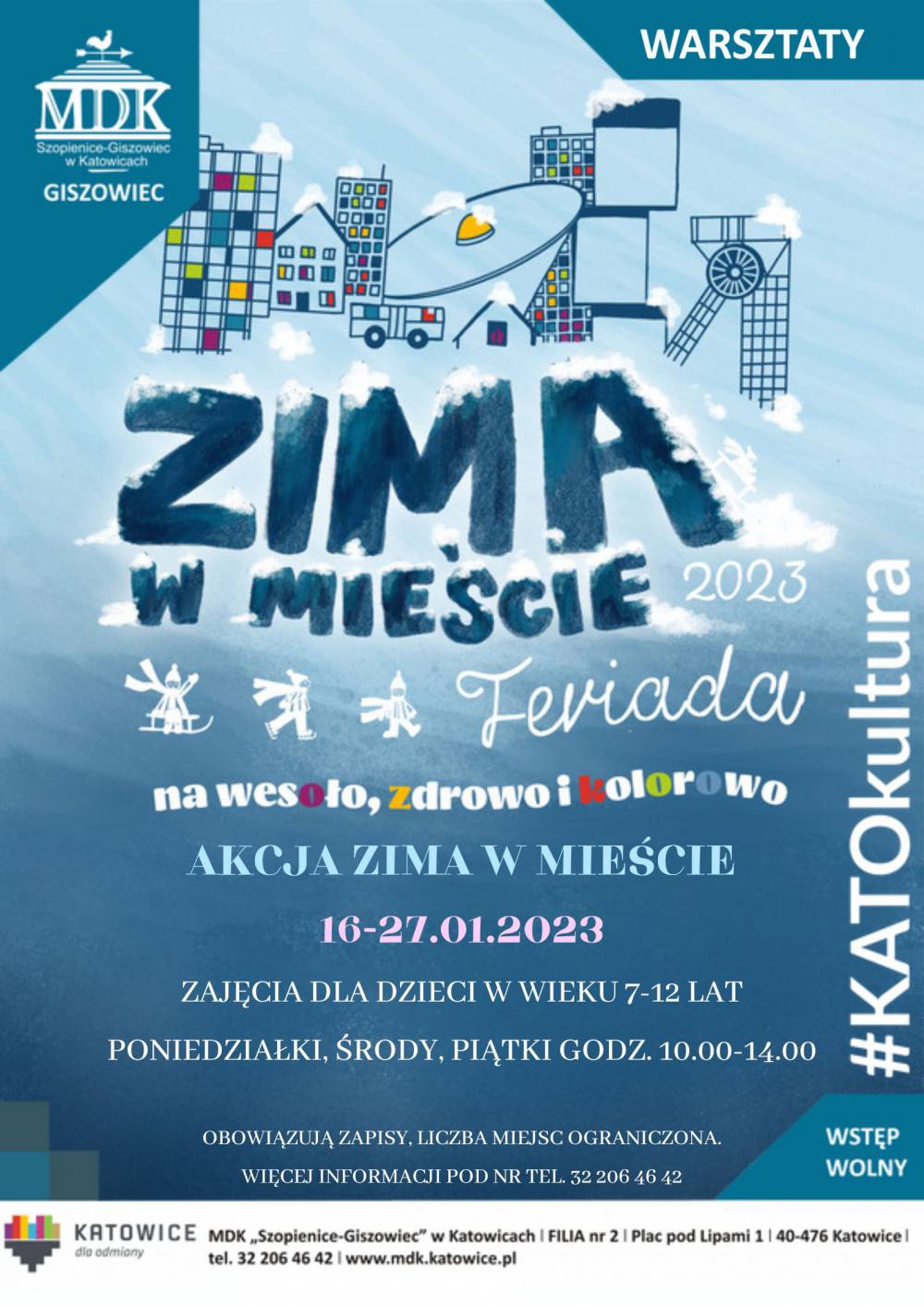 Zapraszamy na magiczny Giszowiec na akcję "Zima w mieście", która odbywać się będzie w filach Miejskich Domów Kultury. Bezpłatne zajęcia dla dzieci w wieku 7 - 12 lat obejmować będą: gry, zabawy sportowe, warsztaty plastyczne, wyjazd do kina i galerii. Obowiązują zapisy ze względu na ograniczoną ilość miejsc.